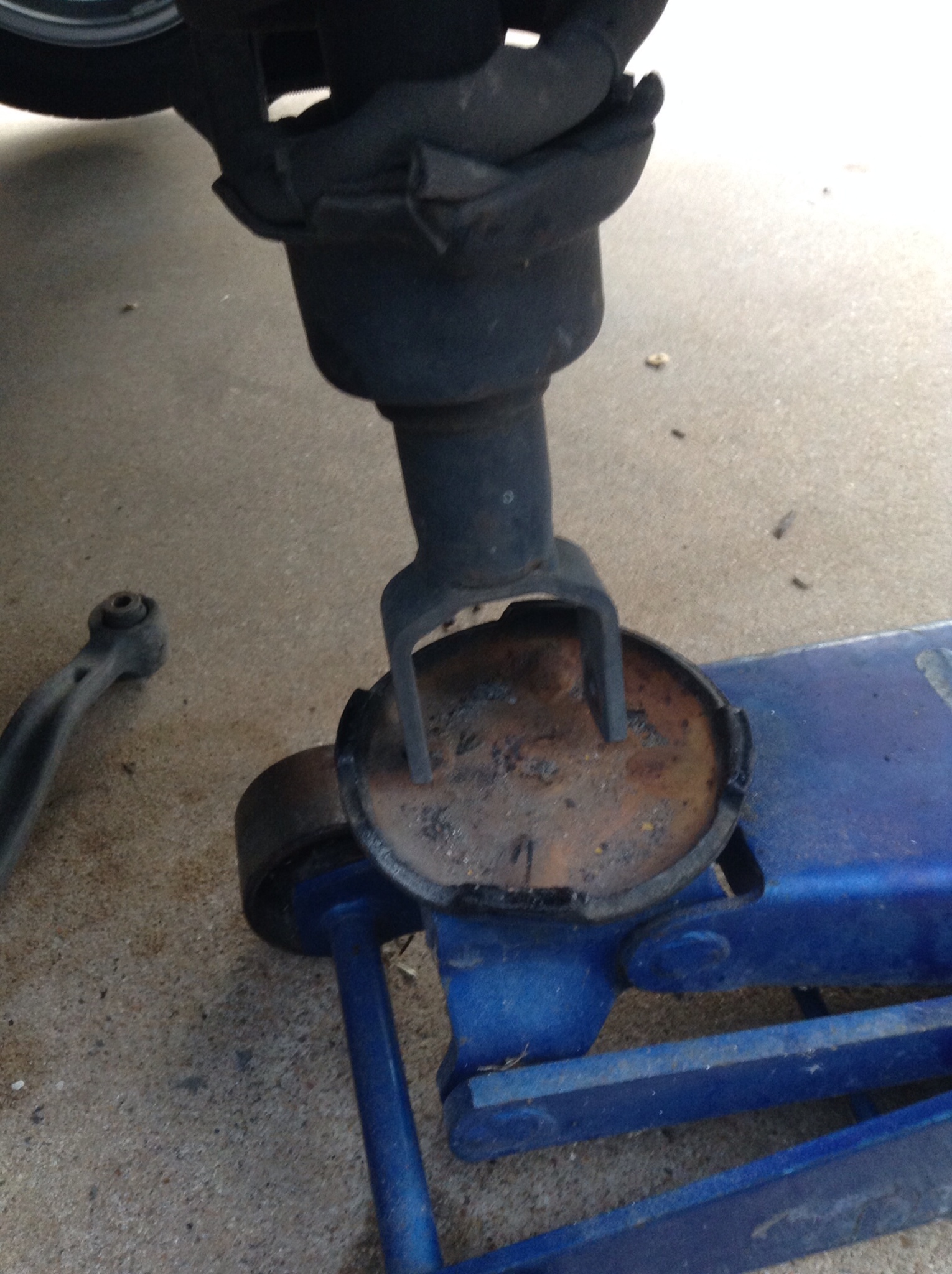 Then put your jack back under the strut. Just so when you remove it it doesn’t just drop out. If you’re replacing it I guess it doesn’t especially matter if it drops.