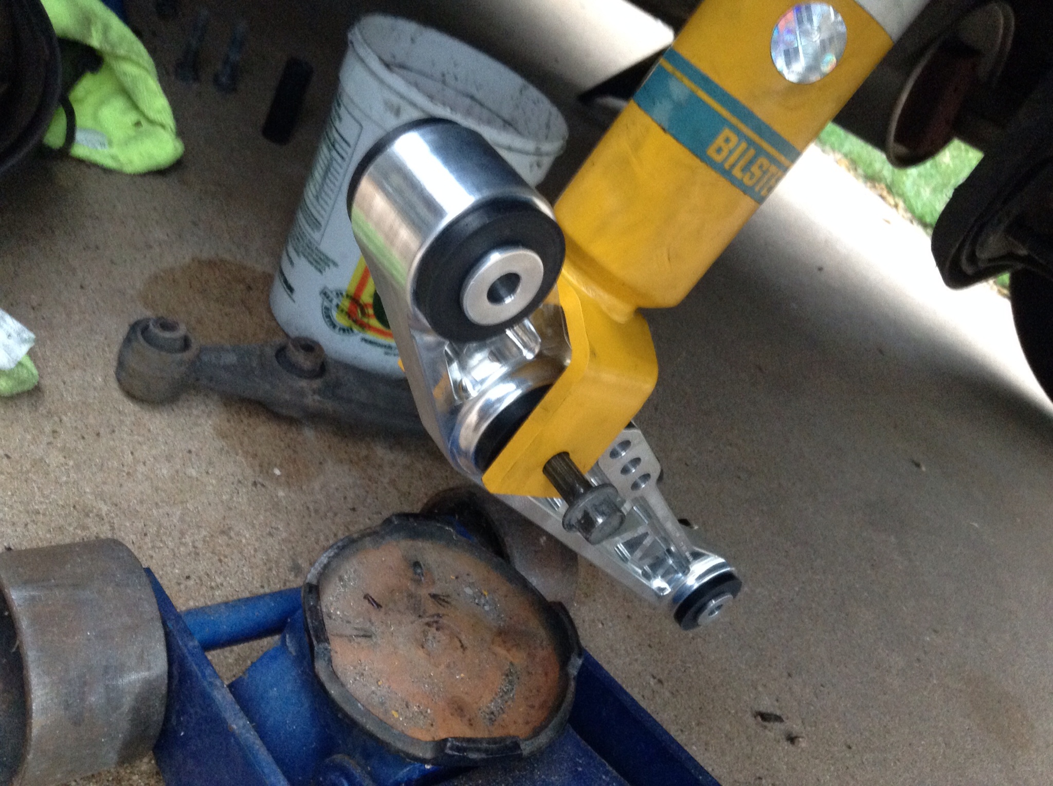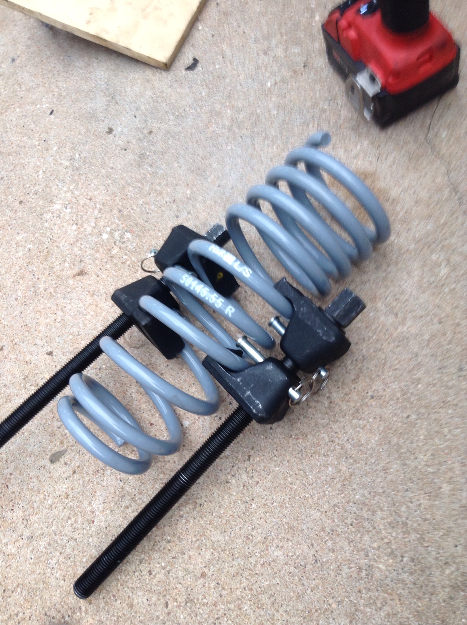 Once you have it compressed enough you can drop it over the strut, cram the top hat on and get that nut in place. I found with the energy suspension top hat bushings that you had to press down on it a good bit and try to wrangle that nut on, even with the spring fairly well compressed. Just FYI.